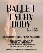 Ballet for Every Body is a welcoming, one-hour technique class designed for all levels, all bodies, and all backgrounds. Whether you’re new to ballet or reconnecting, this class focuses on balance, alignment, and strength in a supportive environment. You’ll explore classical movement principles through an inclusive, body-positive lens — no judgment, no perfectionism, just joyful movement and beautiful lines at your own pace.
